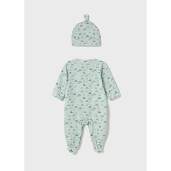 Ensemble Mayoral bébé garçon à manches longues de 0 à 18 mois. Composé d'un pyjama d'été en coton vert jade avec imprimé petites voitures et d'un bonnet en coton assorti.